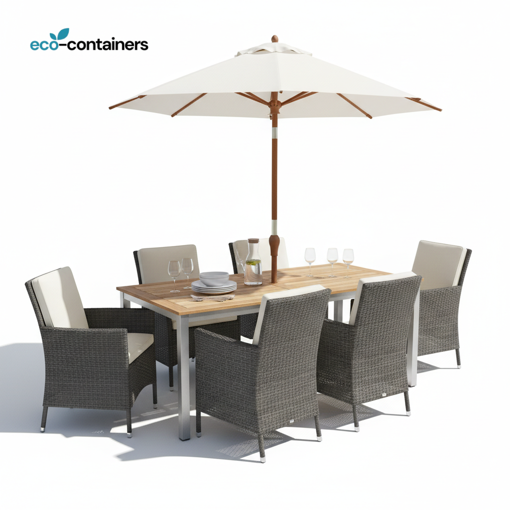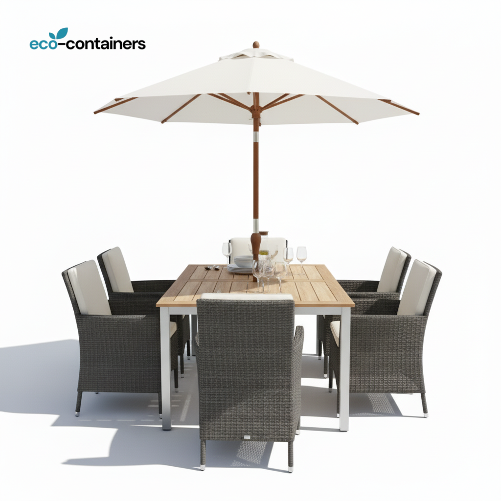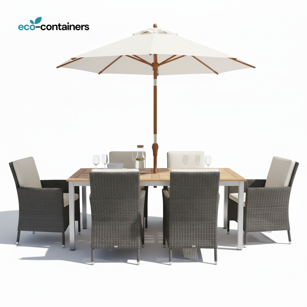 The eco-containers PF-700 is best for Homeowners and consumers seeking a single purchase that completely furnishes an outdoor dining area with a focus on style, long-term durability, and immediate usability (table, chairs, and shade included).